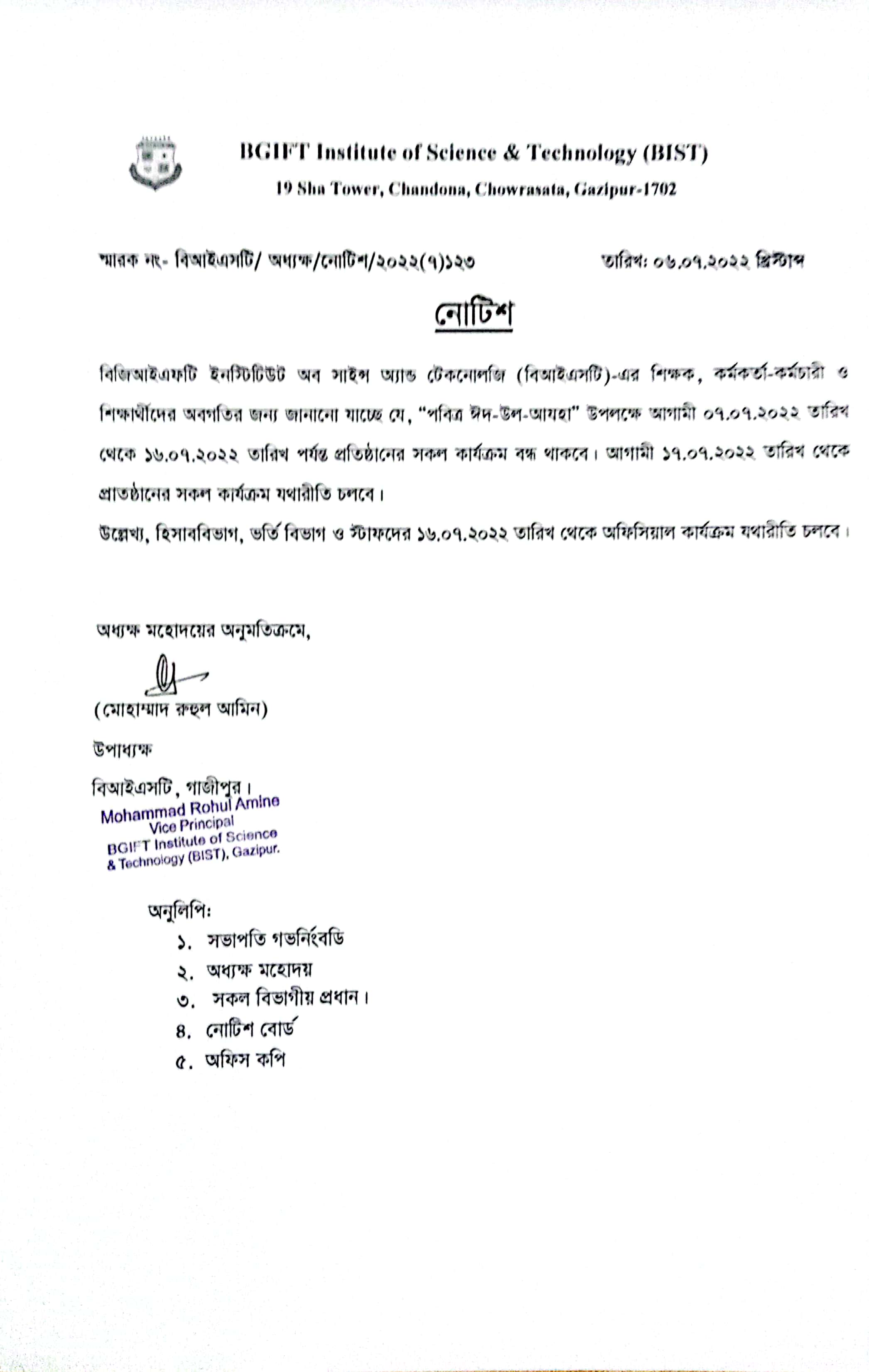 পবিত্র ঈদুল-আযহা উপলক্ষে ছুটি সংক্রান্ত নোটিশ