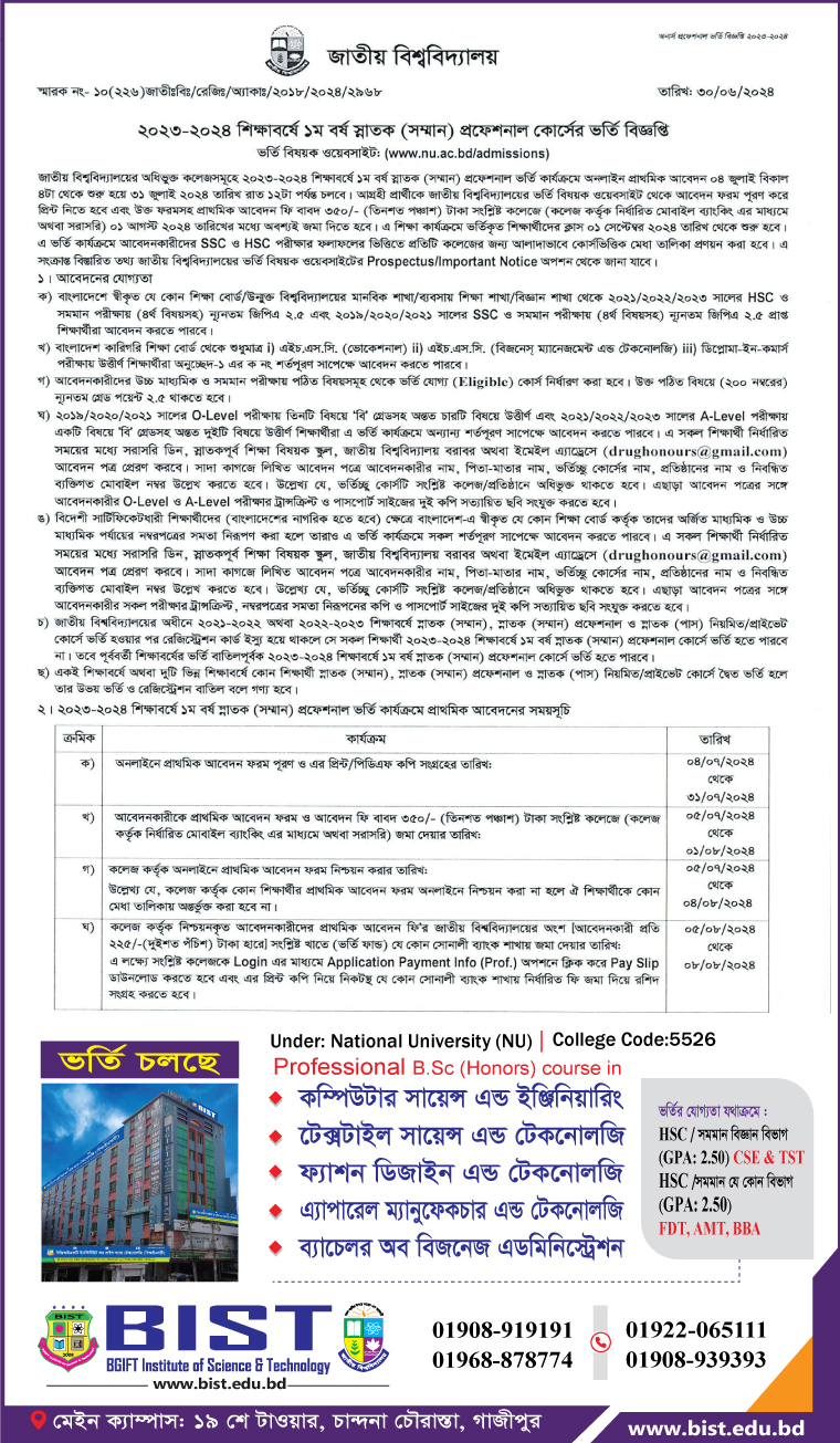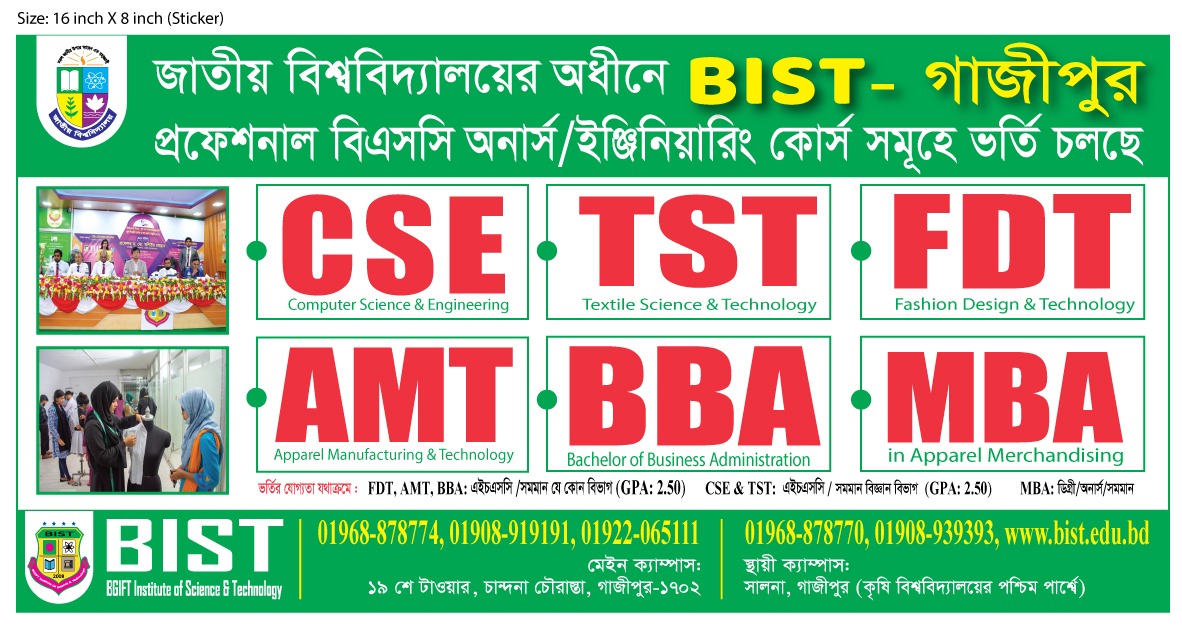 ভর্তি বিজ্ঞপ্তি-২০২৩। BIST গাজীপুর চৌরাস্তায় জাতীয় বিশ্ববিদ্যালয়ের অধীনে পাঁচটি বিষয়ে অনার্সে ভর্তি চলছে । অনলাইন থেকে ফরম সংগ্রহ করে অনলাইনে ফিলাপ করে এন্টি দিতে হবে এবং একটি প্রিন্ট আউট কপি অত্র প্রতিষ্ঠানে জমা দিতে হবে। বিষয়গুলি হলো বিবিএ, এ এম